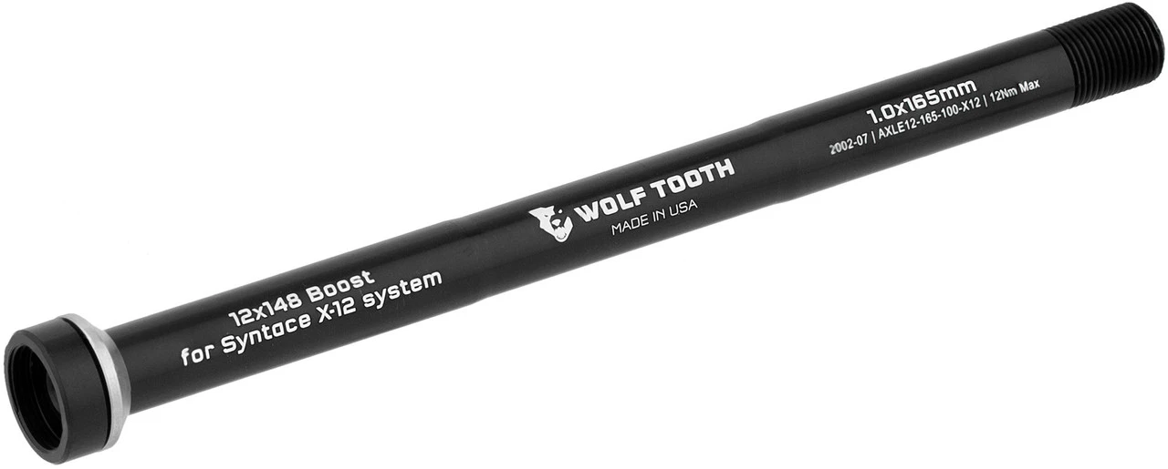 Specifications:Over Locknut Dimension:rear: 142 mm, 148 mmAxle Diameter:Rear: 12 mmTechnical Information:Use:rear: 12 x 142 mm, 12 x 148 mmType:thru-axleAxle Material:aluminium (7075-T6)Axle Length:159 mm (12 x 142 mm), 165 mm (12 x 148 mm)Nominal Diameter:M12Thread Pitch:1.0Thread Length:12 mmCompatibility:Syntace 12 mm rear thru-axle systems (X-12)Features:with fixed conical stainless steel washer, protects the forkstiffer interface, protection against jamming5 and 6 mm hex fittingnon-Boost and Boost versionMade in the USA
